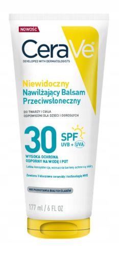 Niewidoczny balsam przeciwsłoneczny CeraVe SPF30 do twarzy i ciała, zapewnia wysoką ochronę UVA i UVB w lekkiej, szybko wchłaniającej się formule.